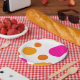 White plate with graphic pink yellow and orange polka dot pattern. Background colour can be customised.