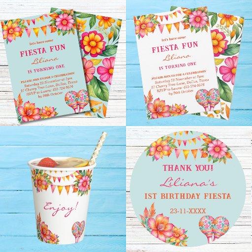Add a vibrant touch to your celebration with these personalised Fiesta 1st Birthday paper napkins! These beautifully designed napkins feature bright pink, orange and yellow flowers against a crisp white background, perfectly embodying the lively spirit of a Mexican First Birthday Party theme. The colourful floral maracas in shades of pink and orange add a festive flair, making these napkins an ideal choice for a Spanish-inspired celebration. Bring colour and cheer to your Fiesta 1st Birthday Lunch or Picnic with these charming paper napkins.