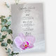Customise the pretty Pink Orchid and Veil Wedding Menu with the details of the meal that you will serve at your wedding dinner or luncheon by adding the salad or first course, entree or second course and dessert or third course. Personalise it with the names of the bride and groom, reception location and marriage ceremony date. Feel free to change the text or font to suit your nuptial needs. This elegant flowery wedding menu features a floral photograph of a pink phalaenopsis orchid flower blossom with a bridal veil. Perfect inspo for the couple who has planned a classy garden party celebration event theme.