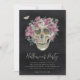 A spooky chic Halloween party invitation featuring a floral skull illustration topped with pink orchid watercolor flowers on a smoky black background. Personalise this unique and elegant Halloween party invitation with your event details in white lettering.
