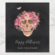 A spooky chic Halloween party design featuring a floral skull illustration topped with pink orchid watercolor flowers on a smoky black background. Personalise with two lines of custom text.