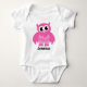 Pink owl cartoon baby clothing for newborn girl. Personalised creeper with child's name. Girly jumpsuit with bird animal mascot design. Cute gift for granddaughter.
