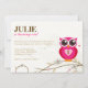 Pink Owl First Birthday Party Invitation. A really cute and whimsical pink coloured owl with a heart on its front sitting atop flourish branches and leaves. Owl holds the number one to show the age of the birthday girl (number can be changed for whatever year you choose) A neutral cream background really makes not only the owl illustration pop but your text as well. Whimsical and cute, it makes the perfect girl first birthday party invitation!