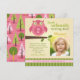 Invitation design features a pink owl sitting on a tree branch and framed space for your child's photo on the front, and a pattern of modern colourful trees on the back. Colours include pink, green, brown, and yellow-orange.