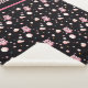 whimsical pattern of light pink owls, soft purple moons, and playful polka dots and stars on a midnight black background.