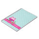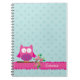 Personalised Notebook featuring a little pink cartoon owl sitting on a branch with green leaves and hot pink flowers and aqua polka dots. Cute and fun design for for girls. Customisable name gift