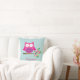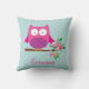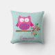 Personalised pillow featuring a little pink cartoon owl sitting on a branch with green leaves and hot pink flowers. Customisable name. Fun design for girls. Ideal for customisable gifts.