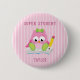 A great way to reward good citizenship, this "super student" button features a pink owl on a pink and white vertically striped background. "Super Student" is written in pink font with the student's name at the bottom. Make a child feel special today!