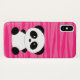 This cute animal iPhone X case features and girly black and white panda design on a zebra print in shades of magenta pink.