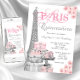 Paris Quinceanera invitation with beautiful silver Eiffel Tower, elegant Paris gift packages, silver glitter high heel shoes and fancy pink Paris script on a pretty pink floral background. This beautiful Paris Quinceanera invitation is easily customised for your event by simply adding your details in the font style and colour, and wording of your choice.
