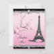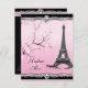 Pink Parisian Eiffel Tower Wedding Invitations are decorated in vibrant shades of pink, black, silver, white and a just a hint of chocolate brown. The front features pink cherry blossom branches for an added elegant effect. In a distance is the Eiffel tower. The top and bottom of the card have silver stylish jewels. Centred between the jewels is a silver pearl with a swirl decor. The back features the same jewel and pearl border with a black background. The text is in matching light pink, cursive fancy font. You can click the orange customise button below the demo card above and change the text colour, style, size and wording to what ever you prefer. You can also use the personalise feature, found to the right of it if you are satisfied with the text colour, style and size. Just change the wording to match your wedding day. After you are done, glance over the front and back of the demo to see what the results will look like before ordering. Each invitation comes with a white envelope. If you love this design, click on "natureprints" or "store" above to find matching RSVP cards, wedding seals and much more. You'll also find peacock, damask and other popular themed wedding stationary.