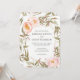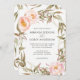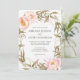 A lovely floral wreath with lush pink peonies and greenery encircles the text of this stylish wedding invitation.