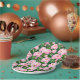 Paper plates in soft pink peonies, scattered against a dark green, background of leaves