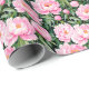 Wrapping Paper in soft pink peonies, scattered against a dark green, background of leaves