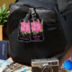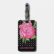 Elegant luggage tag done in black with tiny white polka dots and watercolor artwork of a pretty pink peony flower bloom. Personalise the pink text, on the front and back, to read what you want. Lovely way to spot your luggage from a distance.