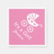 Pink personalised It's a girl baby shower napkins. Neutral design with cute baby carriage. Adorable Stroller / baby buggy with hearts illustration. Make your own napkins with customisable text. In pink and other colours lile purple yellow blue grey etc. Cute idea for new mum, mother to be.