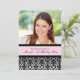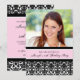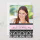 Custom Photo 25th Birthday party invitations in elegant and pretty light pastel blush pink, black and white classic floral damask pattern. Add your name, photo, and party details for a unique and stylish 25th birthday party invitation.