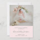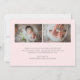 Photo birth announcement card featuring a simple design with one square picture on the front with baby's name in an elegant script and her birth stats in grey over a pink background. The back side has a photo collage with two horizontal pictures and your custom message. This elegant birth announcement card is a great way to announce the arrival your newborn baby girl.