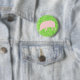 This button features a cartoon style pink pig. It has its head down ready to gobble up whatever food it can find. The background is a mixture of different shades of green to create the impression of grass.