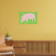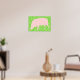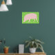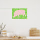 This poster features a cartoon style pink pig. It has its head down ready to gobble up whatever food it can find. The background is a mixture of different shades of green to create the impression of grass.