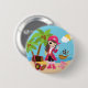 This design on these cute pirate birthday party buttons features a pirate girl dressed in pink standing on a beach by a palm tree and a treasure chest full of gold. A pirate ship can be seen in the distance, anchored in the ocean. Some graphics by Pretty Grafik at Mygrafico.com.