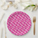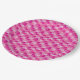 This party paper plate features squares in different shades of pink in a pixelated pattern resembling 16 bit graphics in popular video games.
