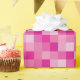 This wrapping paper features squares in different shades of pink in a pixelated pattern.