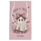 Make your Halloween gift-giving extra adorable with this charming paper gift bag featuring a sweet little ghost wearing a pink plaid bow! Surrounded by bats and autumn leaves, this cute ghost design is the perfect mix of spooky and sweet.