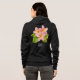 A design on front and back of the hoodie. On the front, your name is on the left pocket in sketchy white lettering. On the back, a large plumeria frangipani blossom. Pink flower with green leaves. And your name again, in matching white lettering.