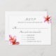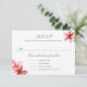 Pink plumeria flowers reply cards with wedding entree selections. White cards have Hawaiian flowers in the corners. Include up-to three menu items and an option to decline attendance. Reverse is white.