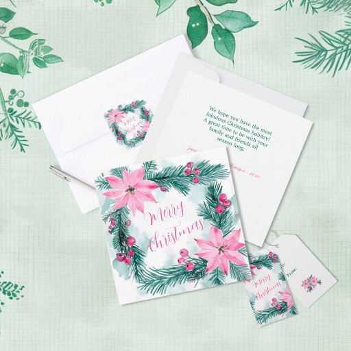 Poinsettias are Christmas! There are lovely pinks in the beloved flowers and berries in this vintage watercolor. The green and teal-green foliage form a nice wreath in this lovely botanical that will enhance the greetings you want to send your friends and relatives for the winter holidays. All of the text can be edited. If you prefer another greeting, other than the "Merry Christmas" we have here, you can substitute that. Be sure to change the example names and date on the reverse of this flat card. The other example text on the reverse side can also be changed to a greeting of your choice, or delete it if you want to your own hand-written entry.