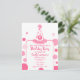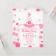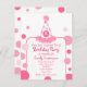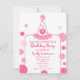 A birthday party invitation featuring a pink colour scheme. Illustration of a party hat with pink polka dots and fringe at top. Personalise with number on hat. Polka dots surround customisable pink text. Polka dots on reverse.