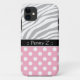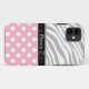 Stylish and girly iPhone 5 Case designed with a grey & white zebra stripes pattern, white polka dots over pink, and personalised with your name or custom text in white over black.