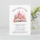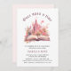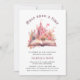 Customisable pink princess birthday invitation, featuring a magical pink princess palace with flowers and a fairy tale book.