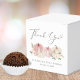 Elegant baby girl shower party favour boxes featuring "Thank You" and "A Sweet Little Pumpkin Is On Her Way" in simple grey typography and a grey script with a heart swash and watercolors of pink and cream pumpkins and floral bouquets.