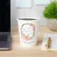 Cute paper cups for your baby shower featuring "a sweet little pumpkin is on her way" written in a mixture of simple grey typography and a script with a heart swash, and a wreath of pastel pink, peach and cream pumpkin and floral watercolors.