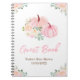 This cute and whimsical watercolor baby shower guest book features pastel pink pumpkins and beautiful floral arrangements. The text combines handwritten script and sans serif fonts for a stylish and modern look. This is perfect for an autumn fall baby shower.