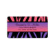 Colourful zebra stripe label that contains a pink, purple and black animal print pattern.