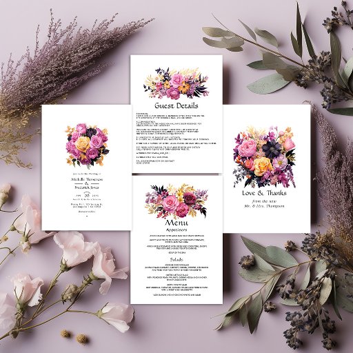 Pink, purple, black, and gold floral wedding menu. Ideal for any given theme or garden wedding.
