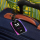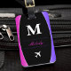 Girly pink, purple and black name tag for travel suitcase. White aeroplane icon and white name initial. Customise the name, initial and contact information.