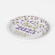 Customisable graduation party class of 2025 plates in glamourous gold and purple confetti pattern and elegant hand lettered style text.