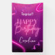 Modern and ultra festive Surprise!!! Happy Birthday banner, featuring pink and purple confetti, curled pieces of pink and purple ribbon and pink neon lights. Background features a modern pink to purple to black gradient. Personalise with name and let's get the party started!