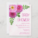 Features a floral bouquet of pink and purple dahlias for a late summer or early fall baby shower