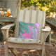This fun and tropical outdoor cushion is decorated with a bright pink flamingo and palm leaves on a purple background, making it the perfect summertime accessory for the beach house, patio, deck or pool area.