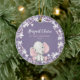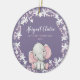 Decorate your tree with this cute girl elephant first Christmas ornament. Design features a pink and white floral wreath and baby elephant on a purple background.