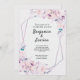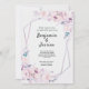 The hexagons are adorned with pale white and pink flowers and lush greenery, creating a delicate and ethereal design. With the paleness of this invitation, the few pops of green really stand out, adding an unexpected touch of nature to the geometric design. The floral details add a touch of romance and femininity to this otherwise contemporary design, making it a perfect choice for couples who want something unique and memorable for their wedding invitations.