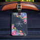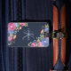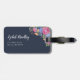 Dark blue floral luggage tag with flower arrangements in orange, pink, purple, and blue. Add your name and initial.