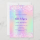 A girly and feminine 10th birthday party invitation. On front: A rainbow, holographic coloured background in purple, pink, mint green. Decorated with blush pink confetti. Personalise and add a name and party details. The name is written with a hand lettered style script, purple coloured letters.