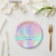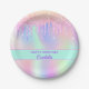 A girly trendy holographic background with unicorn and rainbow pastel colours in pink, purple, mint green. Decorated with drips in pink, purple. A mint green band. The text: Happy Birthday. Purple coloured letters. Personalise and add a name.