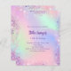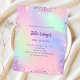 A girly and feminine 18th (or any age) birthday party invitation. On front: A holographic coloured background in purple, pink, mint green. Decorated with pink and purple faux glitter. Personalise and add a name and party details. The name is written with a hand lettered style script, purple coloured letters.